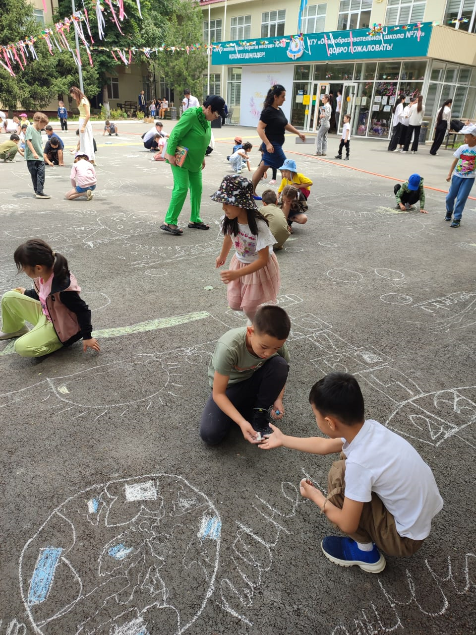 Далее школьный двор наполнился красками — прошёл конкурс рисунков на асфальте, где каждый смог проявить свою фантазию и талант. Победители получили кубки за лучшие работы!