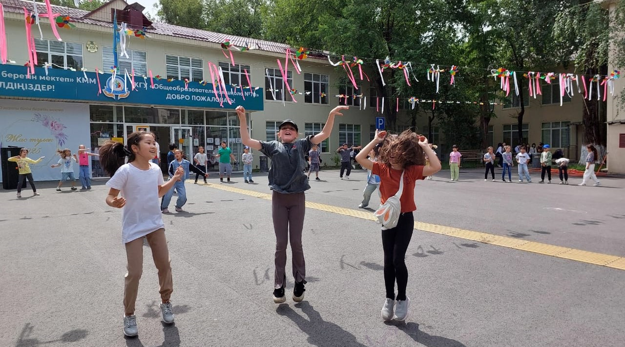 Одан кейін балалар асфальтқа сурет салып, мектеп ауласын түрлі түсті көрмеге айналдырды. Ең үздік суреттер авторларына кубоктар табысталды!