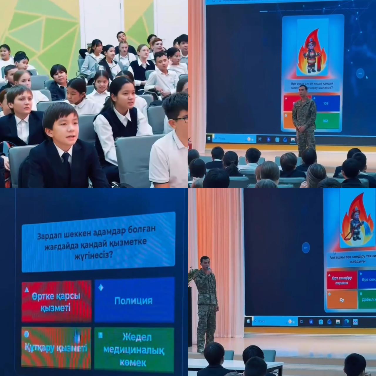 Алынған білімді бекіту мақсатында мамандар өрт қауіпсіздігіне арналған авторлық викторина ұйымдастырды. Оқушылар сұрақтарға жауап беріп, шартты белгілерді танып, ойын форматындағы жағдаяттық тапсырмаларды шешті.