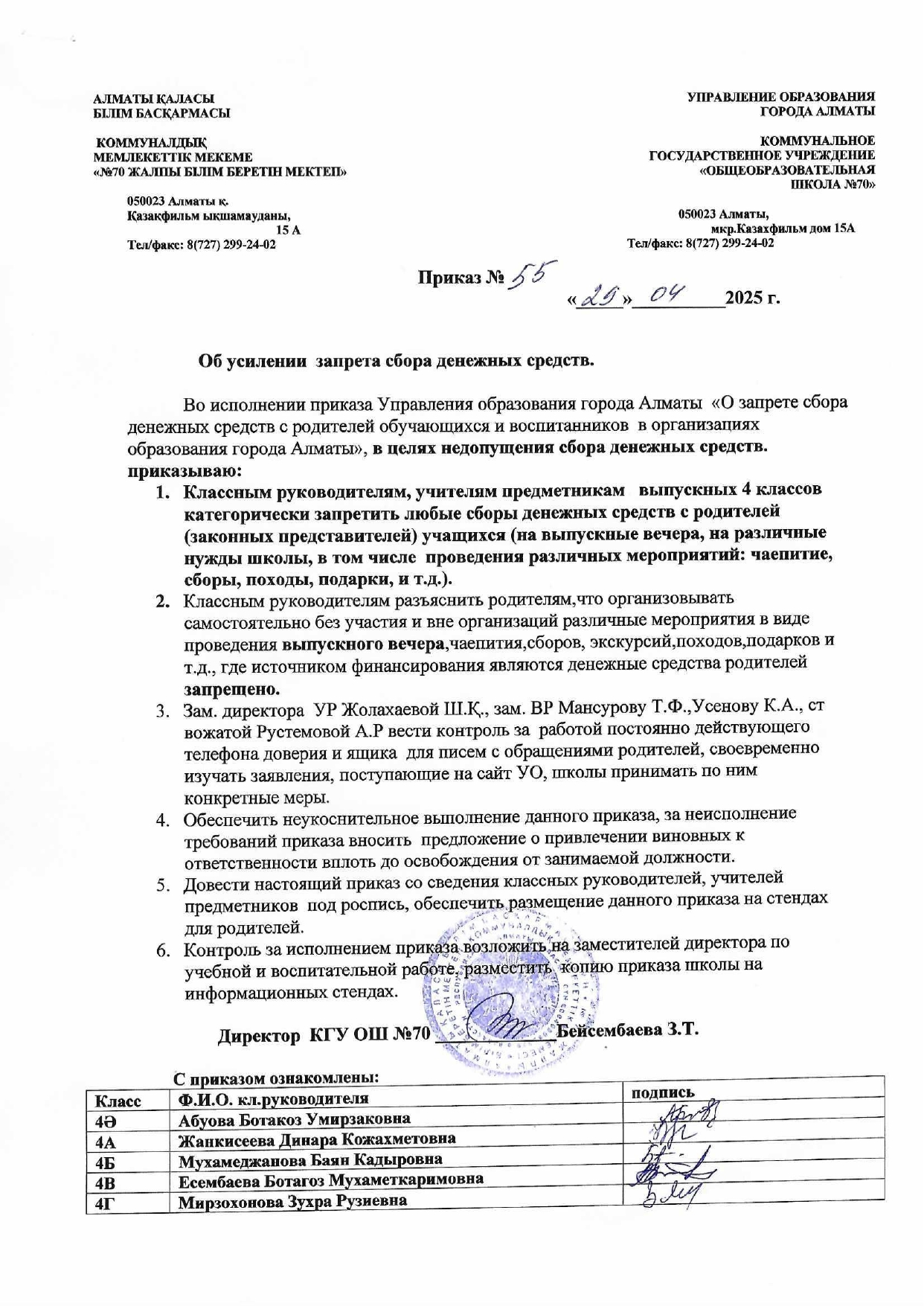 Ақшалай жинауға тыйым салуды күшейту туралы бұйрық 4 сынып - Об услиении запрета сбора денежных средств 4 класс