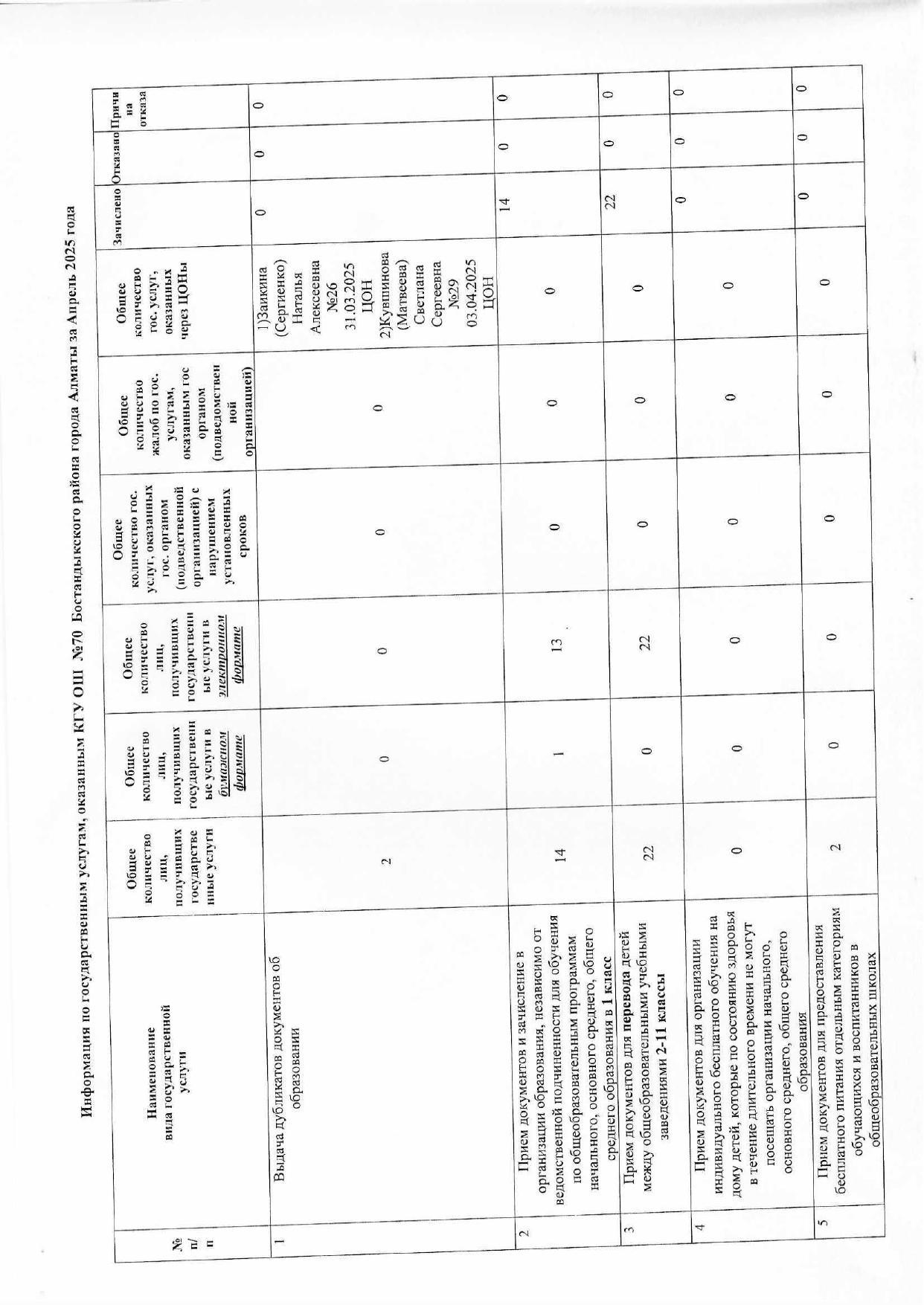Алматы қаласы Бостандық ауданының №70 жалпы білім беретін мемлекеттік мектебі тарапынан 2025 жылдың сәуір айында көрсетілген мемлекеттік қызметтер түрі
