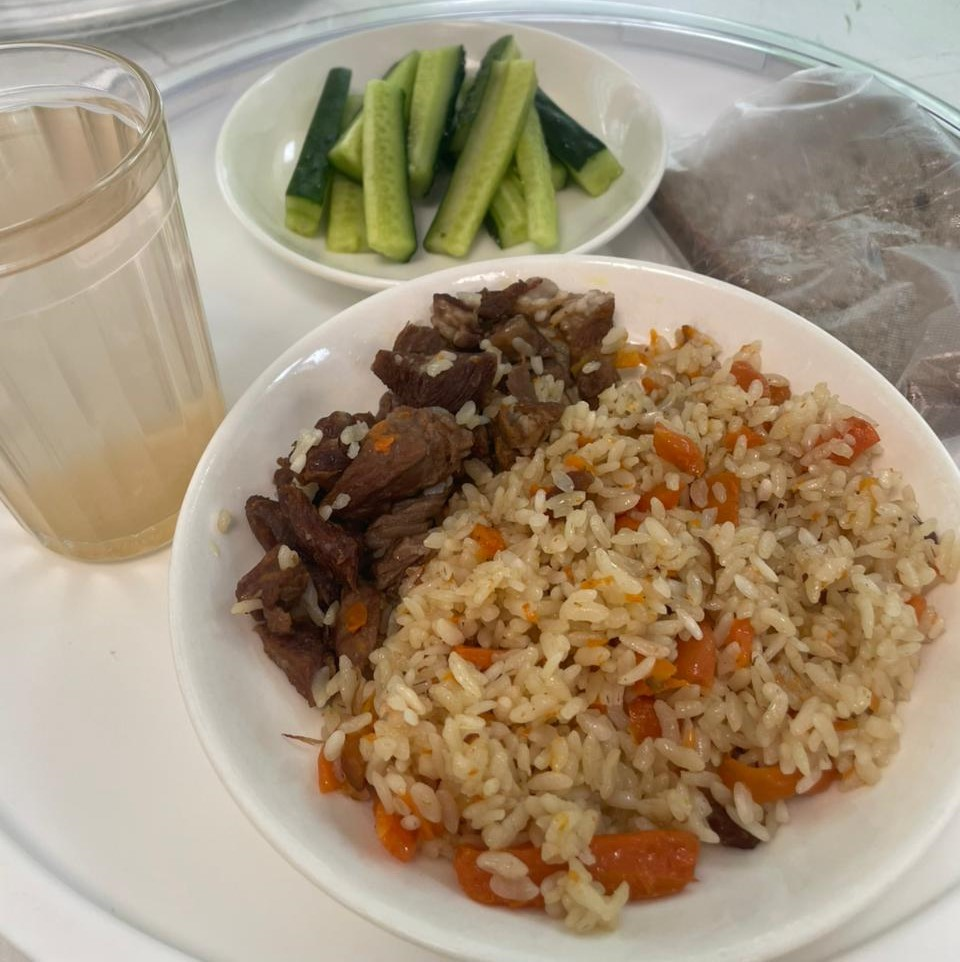 Меню на пятый день третьей недели: салат с фасолью и с огурцами, плов с курицей, напиток лимонно - яблочный и хлеб ржано - пшеничный