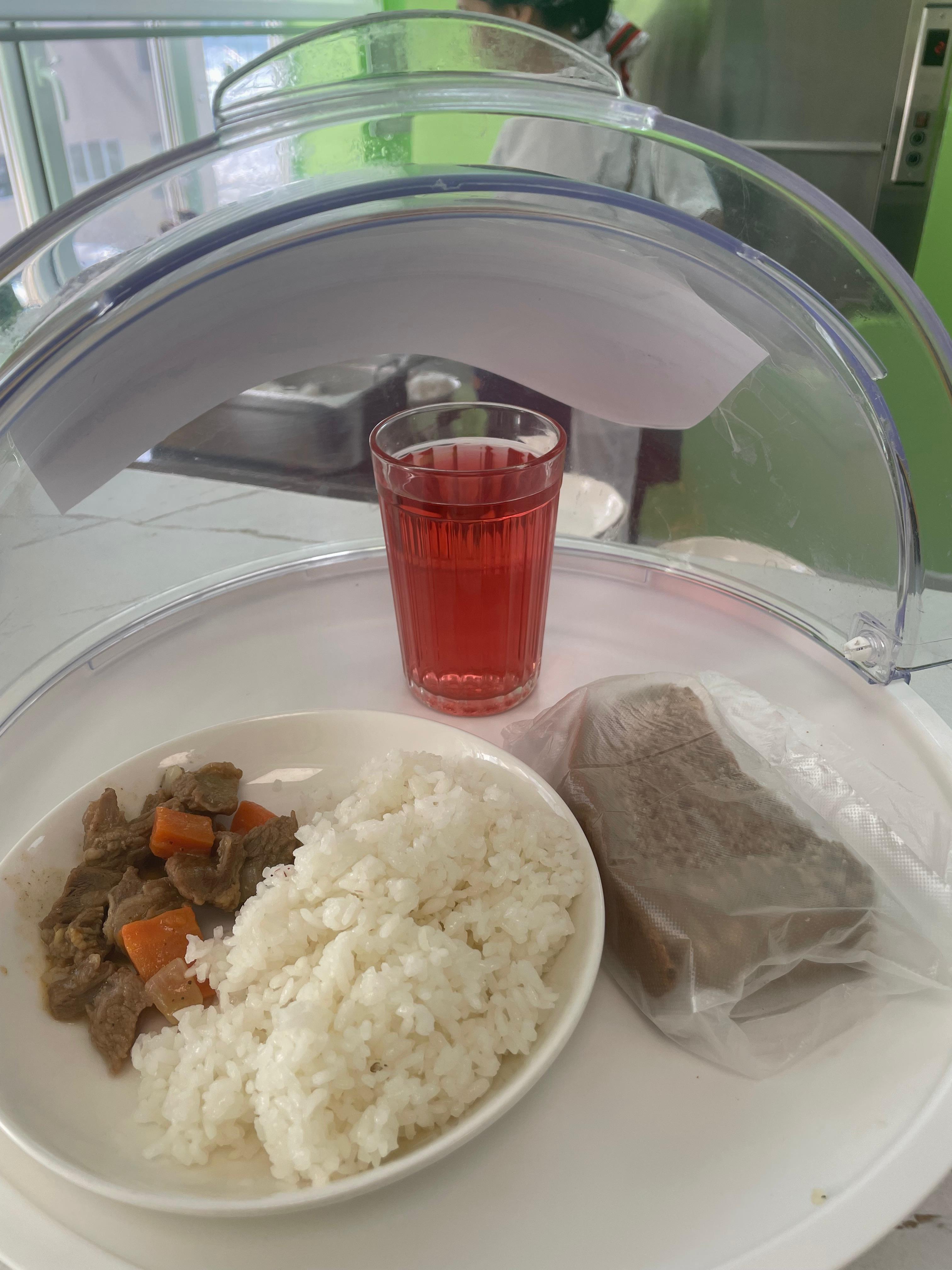 Меню на первый день второй недели: мясо тушеное с овощами, на гарнир рис припущенный, напиток гранатовый (каркаде), хлеб ржано - пшеничный