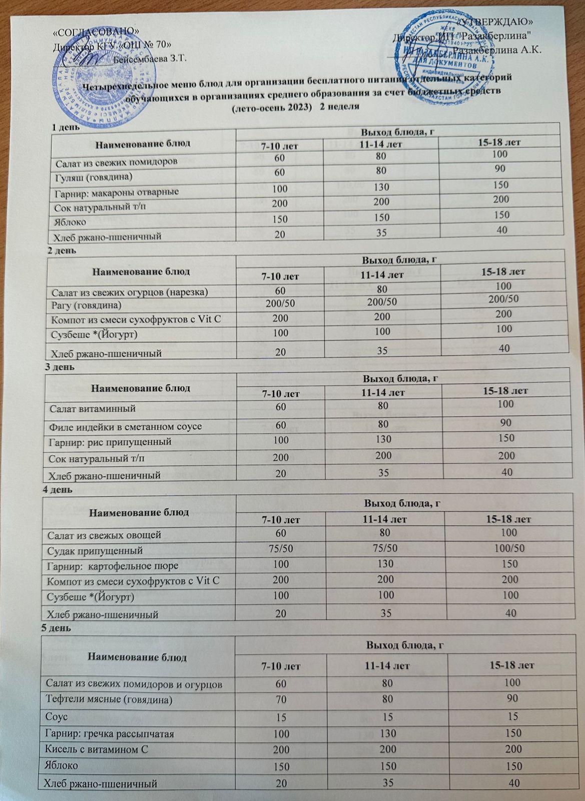 01 сентябрь 2023 0 1 2 3 4 5 лето - осень 2023 2 неделя Лето-осень 2неделя Ежедневное меню учащихся, питающихся за счет фонда Всеобуча.Четырехнедельное меню блюд для организации бесплатного питания обучающихся в организациях среднего образования за счет бюджетных средств