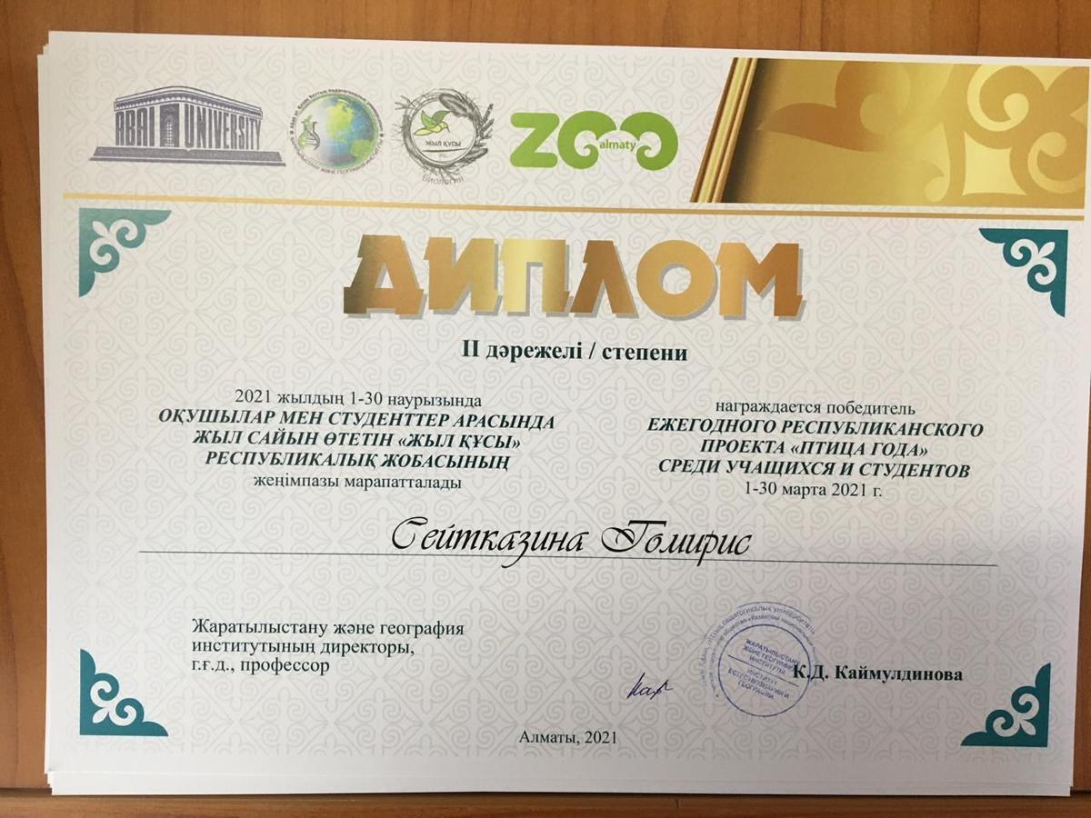 13 апрель 2021 0 1 2 3 4 5 Птица года -2021 Ученица 4В класса Сейтказин Томирис заняла 2 место на городском этапе Республиканского конкурса «Птица года». Выражаем благодарность классному руководителю Зухре Рузиевне за подготовку призёра.